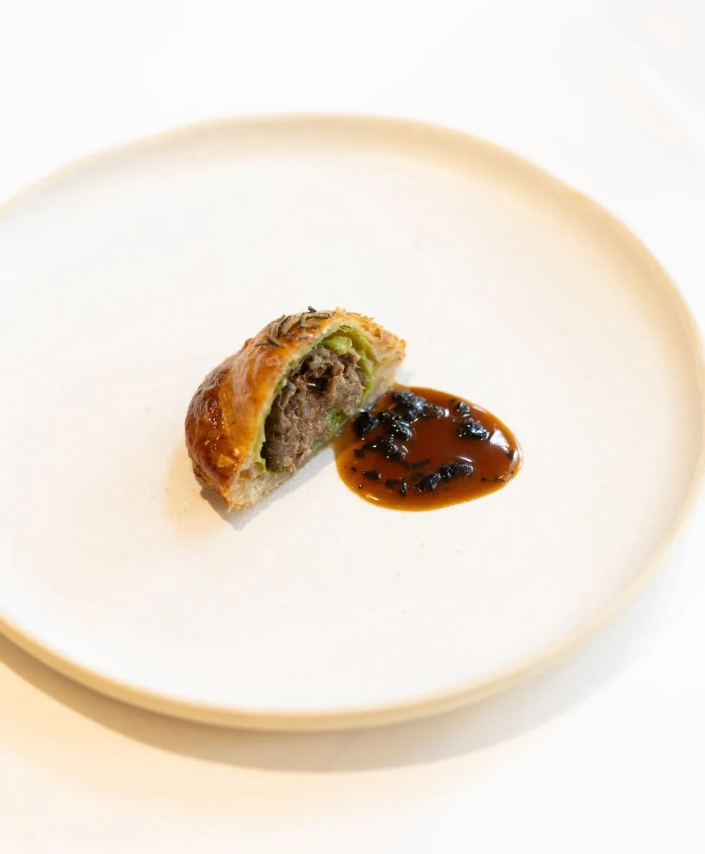 Wellington d’ànec esmicolat i trufat amb salsa de trompeta de la mort